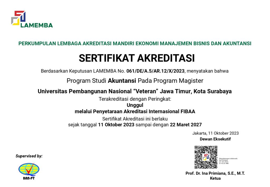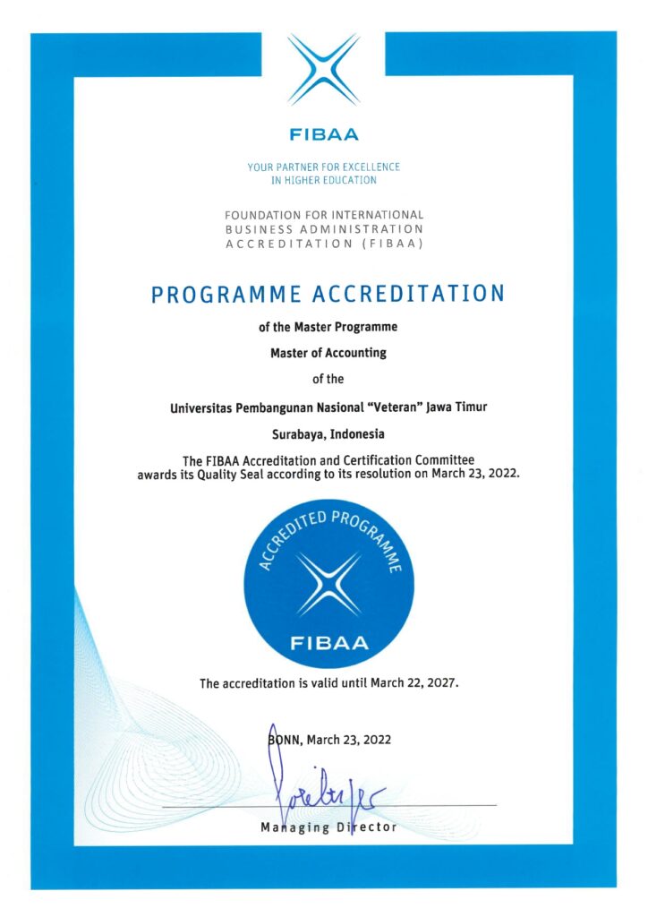 Program studi magister akuntansi Universitas Pembangunan Nasional “Veteran” Jawa Timur berdiri pada tahun 2001 berdasarkan nomor SK Pendirian: Skep/29/VIII/2000 pada tanggal 31 Agustus 2001. Peringkat (Nilai) Akreditasi terakhir adalah “Unggul” dengan nomor: 061/DE/A.5/AR.12/X/2023. Selain itu, Program Magister Akuntansi pada bulan Maret tahun 2022 mendapatkan akreditasi intenasional “Foundation for International Business Administration Accreditation (FIBAA)”.